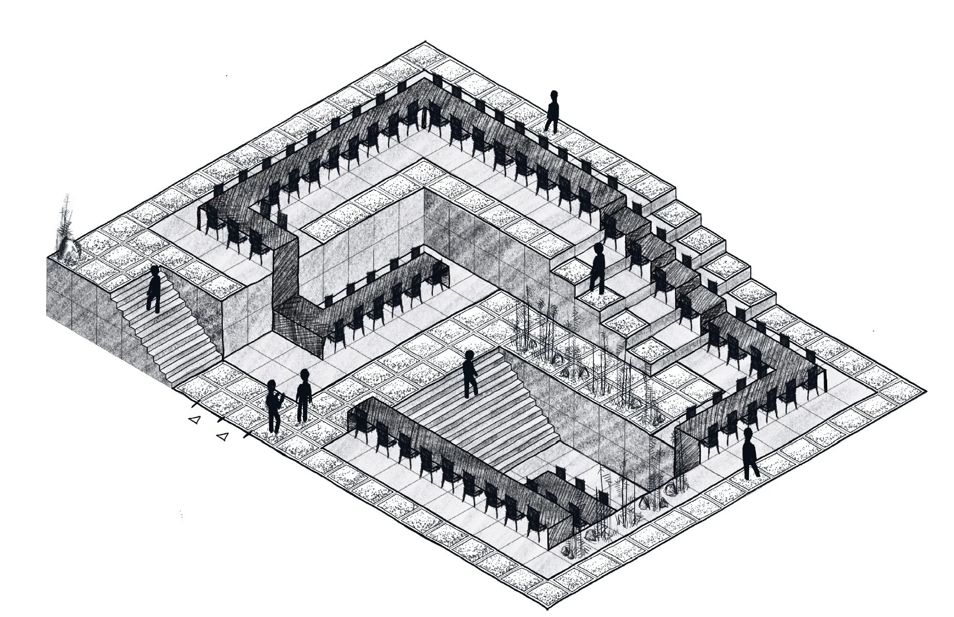 This project reimagines the site west of Place Bell along Elgin Street in Ottawa by replacing the existing parking structure with a multi-purpose facility that balances the needs of corporate tenants, the public, and Operation Come Home (OCH). The main building rises 10 floors and incorporates a structure that serves as an automated parking system for 1,200 vehicles, yet its outward presence is defined by vibrant public areas and a bold, sculptural form that shades the west-facing corporate tower behind it. At grade and throughout the lower levels, generous outdoor seating and landscaped terraces invite pedestrians to linger, blending seamlessly with Elgin’s “restaurant row” atmosphere. Above, a dramatic atrium traverses four stories, providing daylight and visual connections among the building’s various functions. Crowning the structure is the fifth-floor dining room and training kitchen, which is enclosed by glass C-channels that filter sunlight while maintaining transparency. Within this topmost level, a continuous table—elevated on a platform that mirrors the atrium below—serves as the physical and symbolic heart of OCH’s mission, where at-risk youth, staff, and visitors share meals and build community.